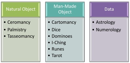 Lastly, humans create highly specialized types of divination based on data rather than objects. Astrology uses the time and place of birth for divination. Numerology uses the letters, vowels and consonants of your name for divination. The question has to be asked, are later types of divination superior to earlier types of divination. Certainly later types of divination supplant earlier types of divination. Ways of looking at data are evolving and metadata, data about data is being used for forecasting. Metadata is being used to predict social link behavior and this may just be the beginning. Astrology became astronomy. Perhaps prediction using metadata will ultimately supplant past systems of divination. Below is a list of divination methods from Wikipedia broken down by the three major types discussed: