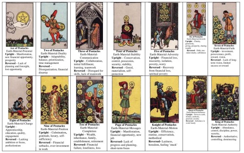 The Suit of Pentacles is one of the four suits used in Latin suited playing cards, such Spanish, Italian and tarot decks. It corresponds to the Suit of Diamonds in standard decks. In tarot, Coins or Pentacles is part of what is called the “Minor Arcana”. Like the other tarot suits, it contains fourteen cards: ace (one), two through ten, page, knight, queen and king. The suit represents the Third Estate (town-dwellers). Tarot cards are used throughout much of Europe to play Tarot card games. In English-speaking countries, where the games are largely unknown, Tarot cards came to be utilized primarily for divinatory purposes. In occult and divinatory usage the suit is connected with the classical element of Earth, the physical body and possessions or wealth. Coins as a Latin suit represent the feudal class of traders, and therefore to worldly matters in general. Associated physical characteristics include dark hair and eyes, dark complexion, and sturdy build. In the Rider-Waite tarot deck and derivative decks, the suit is called the suit of pentacles, and each card incorporates one or more discs each displaying a pentagram. In the Book of Thoth it is called the suit of discs, and the cards are associated with the Taurus, Virgo, and Capricorn signs of the Zodiac.